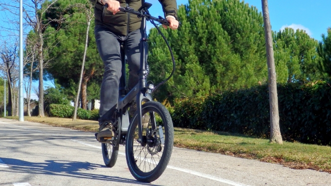 El pequeño motor ubicado en el buje de la rueda trasera (Shengyi de 250 W) tiene un buen empuje: nos hemos movido en un entorno con desniveles no excesivamente acusados y el modo de menor aporte de potencia ha sido suficiente en la mayoría de los casos.