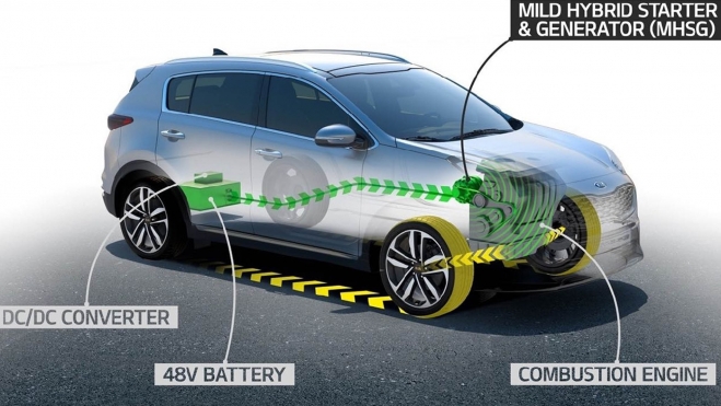 Un híbrido de 48 voltios es básicamente un vehículo con un motor de combustión interna que trabaja junto a un motor eléctrico y una batería, normalmente de menos de 1 kWh, todo a ese voltaje, para aumentar la eficiencia y disminuir las emisiones. Utiliza un motor de combustión tradicional y un generador de arranque por correa (BSG), que juega un papel crucial al funcionar como motor de arranque y generador de electricidad. Además, recupera la energía cinética durante la frenada y desaceleración para recargar una batería de 48 voltios.